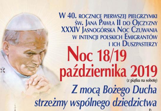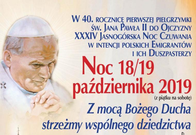 W 40. rocznicę pierwszej pielgrzymki św. Jana Pawła II do Ojczyzny zapraszamy rodaków z kraju i z zagranicy w dn. 18/19 października br. na XXXIV Jasnogórską Noc Czuwania w intencji polskiej Emigracji i jej Duszpasterzy. Hasło tegorocznej pielgrzymki do Domu Matki i Królowej brzmi: "Z mocą Bożego Ducha strzeżmy wspólnego dziedzictwa".