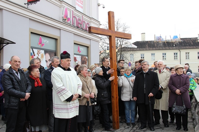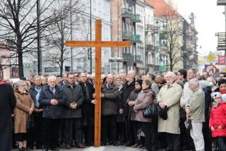 Droga krzyżowa rozpoczęła się przy Grocie Katyńskiej na placu przy Sanktuarium Serca Jezusa Miłosiernego Ojców Jezuitów. Trzymetrowy drewniany krzyż nieśli wierni kaliskich parafii, więźniowie, podopieczni Schroniska św. Brata Alberta, strażacy, młodzież.
