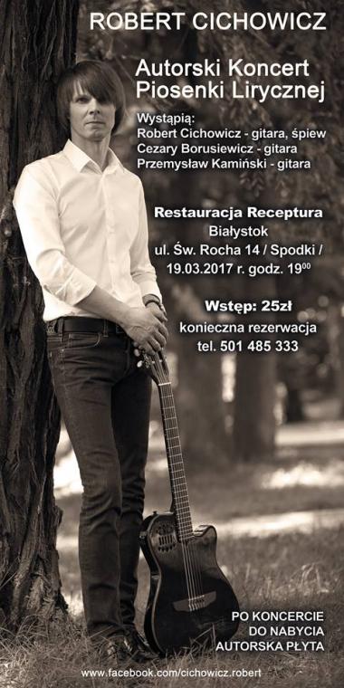 19 marca o godz.19.00 w Restauracji Receptura w Białymstoku (woj.podlaskim) odbędzie się autorski koncert piosenki lirycznej Roberta Cichowicza.Na scenie oprócz wspomnianego wcześniej artysty zobaczymy również z gitarami Cezarego Borusiewicza i Przemysława Kamińskiego.Ze względu na miejsce, w którym odbywa się wydarzenie konieczna jest wcześniejsza telefoniczna rezerwacja.