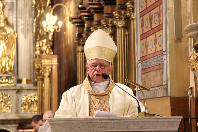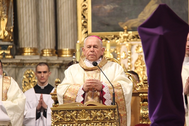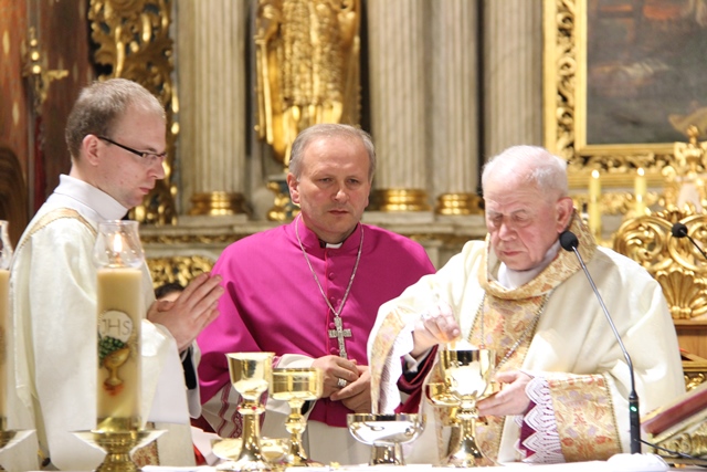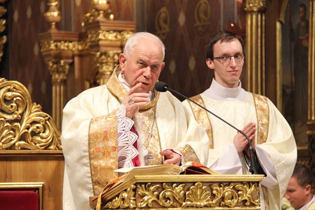 W homilii emerytowany biskup kaliski wskazywał, że uczta eucharystyczna i ofiara przebłagalna są istotą Wielkoczwartkowej Wieczerzy Pańskiej. Zacytował też fragment z Dzienniczka św. s. Faustyny, w którym pisała, że istota śmierci ofiary przebłagalnej Jezusa jest w Wieczerniku. Przekonywał, że między Chrystusem i kapłanem istnieje niezwykła bliskość, pewien rodzaj utożsamienia. – Kapłan to drugi Chrystus. Tak więc Wieczerza Pańska Wielkiego Czwartku dzięki posłudze kapłana trwa we Mszy św. Ilekroć sprawowana jest Msza, uobecnia się w niej Ostatnia Wieczerza jako uczta eucharystyczna, w której Jezus karmi nas swoim Ciałem oraz jako ofiara, którą składa Bogu Ojcu za grzechy świata, za moje i twoje grzechy – powiedział celebrans. Podkreślał, że Jezus oczekuje od człowieka miłości służebnej. – Ma to być miłość, która pochyla się nad człowiekiem, gotowa umyć mu nogi, bez względu kim on jest, skąd pochodzi, jakie zajmuje stanowisko. Miłość służebna klęka przed nędzarzem, wykluczonym żebrakiem, bo jest on człowiekiem. Człowiek dla Boga zawsze jest wielki – stwierdził kaznodzieja. Odniósł się też do słów św. Brata Alberta „Być dobrym jak chleb”. – Uczyńmy te słowa pragnieniem naszego życia. Dzielmy się z innymi tym, czym jesteśmy i co posiadamy. Dzielmy się chlebem, życzliwością, uśmiechem, modlitwą. Dzielmy się miłością, abyśmy mieli radość i abyśmy radość sprawiali innym – mówił bp Napierała.