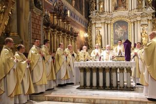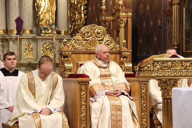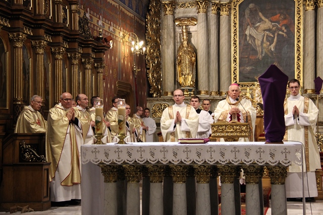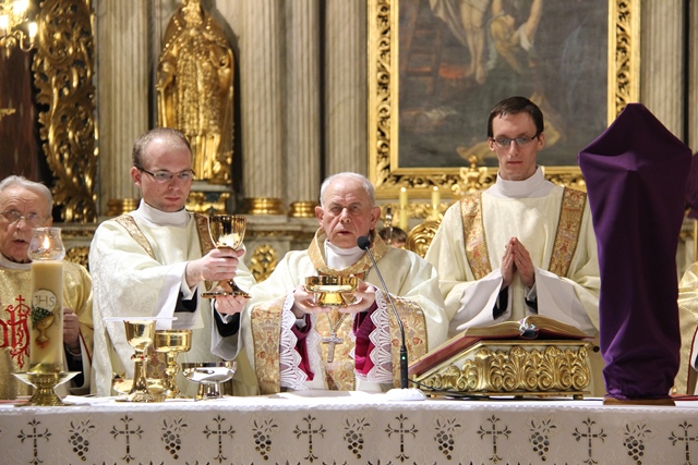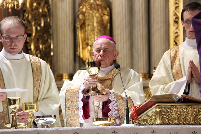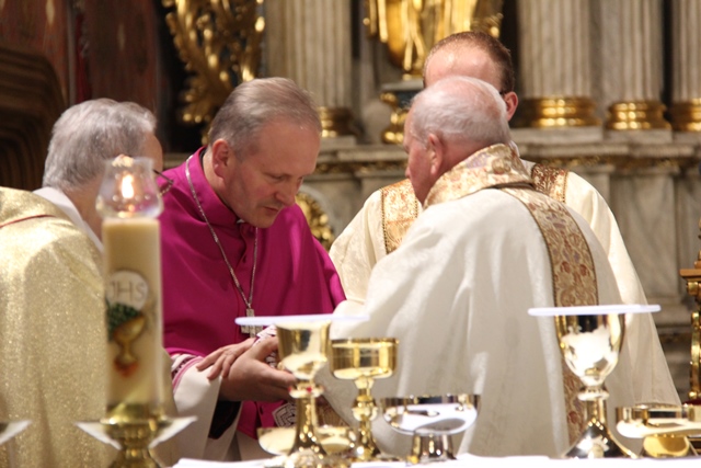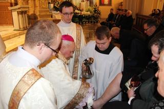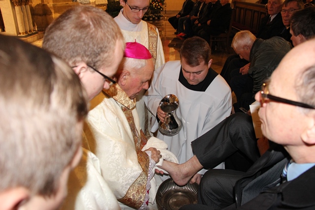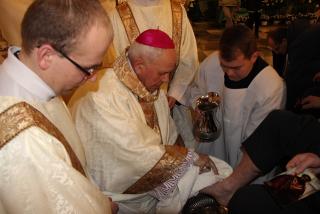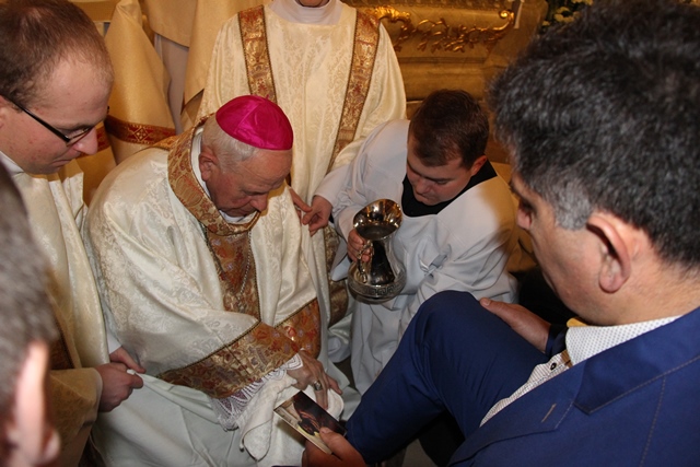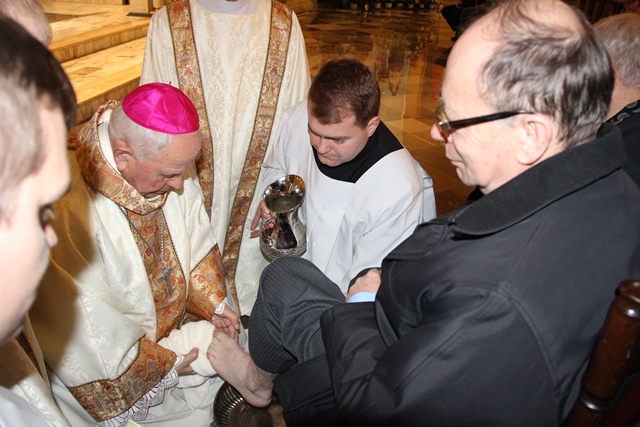 Podczas liturgii Wielkiego Czwartku bp Stanisław Napierała obmył nogi dwunastu mężczyznom – przedstawicielom parafian katedry św. Mikołaja w Kaliszu. Uroczystość była okazją do złożenia przez przedstawicieli parafian i dzieci z Eucharystycznego Ruchu Młodych życzeń biskupom i kapłanom z okazji ustanowienia Sakramentu Kapłaństwa.