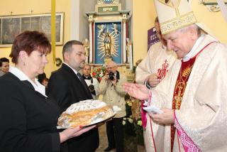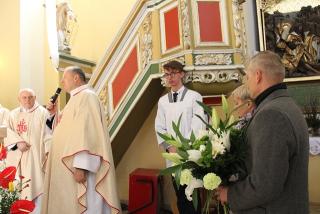 Witając biskupa i wiernych ks. Waldemar Willak wskazał, że obecna murowana świątynia została wzniesiona w połowie XVII w. Dodał, że wyposażenie pochodzi z kościoła Świętego Krzyża na Ostrowskim Tumskim we Wrocławiu. Zaznaczył, że w ołtarzu bocznym znajduje się płaskorzeźba z 1499 r. autorstwa uczniów Wita Stwosza. Proboszcz podkreślił, że dzięki pozyskaniu środków unijnych świątynia została gruntownie wyremontowana. Poprosił biskupa kaliskiego o poświęcenie kamiennego ołtarza i ambony.