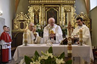 Najpierw była Msza Święta. Tuż przed 12:00 wprowadzono do kościoła parafialnego w Łagowie poczty sztandarowe ochotniczych Straży Pożarnych. Pojawili sie także strażacy w strojach galowych, przedstawiciele władz samorządowych oraz parafianie łagowscy. Msza Święta rozpoczęła się śpiewm Bogurodzicy. Eucharystii przewodniczył dziekan dekanatu świętokrzyskiego, ks. kan Jerzy Beksiński. Koncebransami byli ks. Mieczysław Surus oraz ks. Robert Capała, który wygłosił także kazanie. ks. Robert wskazał na powszechność kultu Maryi w naszym narodzie oraz na konieczność przyłożenia więcej uwagi do katolickiego i patriotycznego wychowania dzieci i młodzieży. W słowie końcowym przed błogosławieństwem ks. Jerzy Beksiński podziękował wszystkim za wspólna modlitwę i zaangażowanie w życie parafii, wskazał też, że w herbie Łagowa jest Maryja z Dzieciątkiem, co pięknie świadczy o naszej miejscowości.