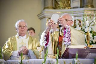 W czasie sumy 53 młodych parafian mikstackich z rąk Ks. Biskupa przyjęło Sakrament Bierzmowania, a wraz z nim Dary Ducha Świętego, które mają pomagać im w mężnym wyznawaniu wiary, w dawaniu świadectwa o Chrystusie w codziennym życiu. W tym dniu przeżywały także zakończenie „Białego Tygodnia” dzieci, które w Uroczystość Zesłania Ducha Świętego po raz pierwszy przyjęły Pana Jezusa do swego serca. Na początku Mszy Świętej ks. kan. Krzysztof Ordziniak, proboszcz mikstackiej parafii poprosił ks. bpa o przewodniczenie uroczystej sumie odpustowej oraz o udzielenie Sakramentu Bierzmowania młodzieży. Przed homilią ks. bp poświęcił krzyże, które mają młodym przypominać o przyjętym sakramencie dojrzałości chrześcijańskiej. W homilii ks. bp Teofil Wilski pochylił się nad tajemnicą Trójcy Świętej. Rozpoczynając homilię powiedział: „Trójca Święta to wielka tajemnica naszej wiary. Bóg jest jeden w Trzech Osobach. Ta prawda jest niezgłębiona, bo Bóg jest niezgłębiony. Skoro człowiek jest ograniczony, stworzony nie może przeniknąć do końca nieskończoności Boga”. Jednak jak podkreślił kaznodzieja, sam Bóg już w Starym Testamencie powiedział nam coś ważnego o sobie, co ważne jest także dla naszego życia. Szczególnie ważna i cenna dla zebranych w mikstacki wieczerniku była ta część homilii, która zawierała wskazania odnoszące się do codziennego życia. Ks. biskup wskazał, że mimo, iż Trójca Święta jest tajemnicą „ Bóg chce nam jednak odsłonić rąbka tego swego wewnętrznego życia, a także przez to powiedzieć coś ważnego o sobie samym, o nas samych”. Ks. Bp zaznaczył, że Ojciec posyła na świat swego Syna, Jezus objawia Ojca, ale także Jego miłość i miłosierdzie. Kaznodzieja wskazał na nieustanne poddawanie się i pełnienie woli Bożej przez Jezusa. Ks. Bp wskazując na znaczenie Ducha Świętego w życiu Syna Bożego powiedział: „W swoim człowieczeństwie naznaczony jest od początku Duchem Świętym. Ten Duch jest Jego mocą, Jego miłością”. Bóg, jak podkreślił ks. bp powiedział nam dużo o swoim wewnętrznym życiu. Podkreślił, że ponieważ człowiek stworzony został na obraz i podobieństwo Boże, jeśli w życiu naśladuje Boga, osiąga godność i cel, do którego został stworzony. Ks. bp podkreślił, że Jezus wypełniając swoje posłannictwo oddał za nas swoje życie. Powinno to stanowić dla nas zachętę do tego byśmy nie bali się ofiarować swego życia Bogu i innym. W dalszej części rozważania ks. bp wskazał przykłady Świętych, którzy oddali swoje życie w służbie Bogu i bliźnim. Powiedział: „Ten, który daje, ofiarnie służy innym ten jest wielki w swoim człowieczeństwie w świetle Bożych dróg”. Biskup Senior wskazał młodym pola działania, które pomogą im stać się ludźmi wielkimi, na których mogą realizować się służąc Bogu i bliźnim. Zwrócił uwagę na zagrożenia jakie niesie współczesny świat zapominający o Bogu, przykazaniach, prawdzie. Kolejna część homilii została poświęcona darom Ducha Świętego. Ks. bp wyjaśnił znaczenie poszczególnych darów w życiu człowieka. Kończąc kaznodzieja nawiązując do przeżywanego przez ks. kan. Zbigniewa jubileuszu podkreślił znaczenie posługi kapłańskiej, zachęcając jednocześnie młodych do refleksji nad swoim powołaniem. Po homilii miało miejsce wyznanie wiary. Młodzi odpowiadali na pytania ks. bpa o wiarę, były to te same pytania, na które przed laty odpowiedzieli za nich rodzice. Następnie ks. bp wraz z kapłanami w geście wyciągniętych rąk modli się o dary Ducha Świętego dla przyjmujących Sakrament Bierzmowania. Po zakończonej modlitwie miało miejsce namaszczenie czoła olejem Krzyżma Świętego, któremu towarzyszą słowa formuły sakramentalnej: „Przyjmij znamię daru Ducha Świętego”.