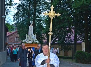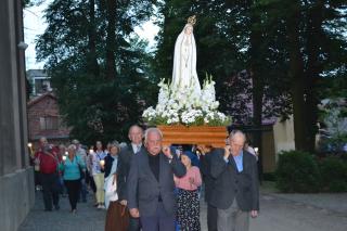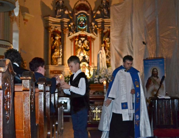 W rozważaniu poprzedzającym modlitwę różańcową ks. kan. Krzysztof przybliżył parafianom stan serc fatimskich pastuszków. Podkreślił, że byli oni posłuszni swoim rodzicom, pełni prostoty i czystości. Jak wskazał, to zapewne było powodem tego, że to właśnie im Maryja powierzyła misje zaniesienia światu swego przesłania. W dalszej części rozważania ks. kanonik przypomniał uczestnikom modlitewnego spotkania treść drugiego objawienia. Zaakcentował rolę i znaczenie ustanowienia nabożeństwa do Niepokalanego Serca Maryi. Podkreślając znaczenie wspólnoty i pracy nad sobą powiedział m.in. „ Nasza parafialna wspólnota ma również swoje serce. Ono bije w każdym z nas. Wciąż uczymy się jaką powinniśmy być wspólnotą. Zadania te wynikają z naszego chrztu. Ponieważ jednak nasza ludzka natura skłonna jest do grzechu, dlatego wciąż modlimy się , pracujemy nad sobą, aby nasze serca były podobne do Serca Pana Jezusa i Niepokalanego Serca Maryi”. Ks. kan. podkreślił, że w wielu miejscach, gdzie miały miejsce objawienia Matki Bożej gromadzą się tłumy wiernych, którzy chcą dotknąć tajemnicy Niepokalanego Serca Maryi. Kończąc rozważanie ks. kan. powiedział: „ My zgromadzeni na nabożeństwie fatimskim odmawiamy różaniec, śpiewamy pieśni maryjne, prosimy Maryję o wstawiennictwo u Trójjedynego Boga we wszystkich naszych potrzebach. Tym samym jesteśmy wspólnotą , której celem jest sam Bóg”. Po zakończeniu rozważania rozpoczęliśmy modlitwę różańcową. Przy pięknie przyozdobionej figurze Pani Fatimskiej nie mogło zabraknąć pastuszków. W ich postacie wcieliły się dzieci z naszej parafii. Ku niebu popłynęła modlitwa, o którą nieustannie prosiła i prosi Maryja… W kontemplowaniu tajemnic różańca pomocne były rozważania ks. kanonika. Przed rozpoczęciem czwartej tajemnicy ks. kan. od świecy płonącej przy figurze odpalił świece pastuszków. Ci zanieśli to światło do uczestników nabożeństwa. Po zakończonej modlitwie różańcowej wyruszyliśmy w procesji z figurą Fatimskiej Pani zapalonymi świecami wokoło kościoła. Podczas procesji rozległo się bicie dzwonów w mikstackiej świątyni. Wzywają nas one i przypominają codziennie od dnia nawiedzenia o Apelu Jasnogórskim. Gdy procesja powróciła do kościoła w duchowej łączności z Jasną Górą śpiewaliśmy: Maryjo jestem, pamiętam, czuwam! Po końcowym błogosławieństwie wierni otoczyli figurę Fatimskiej Pani i zaśpiewali pieśń „ Zapada zmrok…”. Wypowiedziane z życzliwością i uśmiechem słowa „ Dobrze, że jesteś” do osób stojących najbliżej nas uświadomiły nam, że naprawdę jesteśmy wspólnotą. I jeszcze jedna refleksja. Pięknie prezentowała się udekorowana kwiatami Fatimska Pani, ale co najważniejsze otoczona była sercami kochających Ją ludzi.