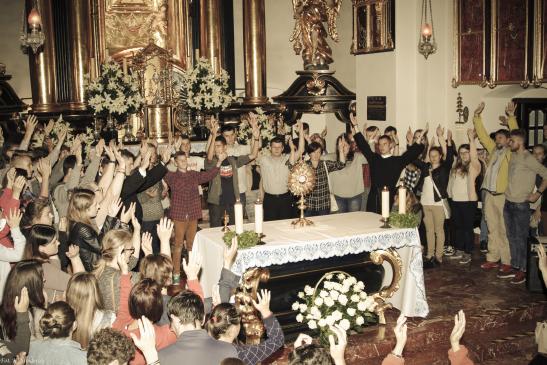 I zstąpił na nich Duch Święty… Patrząc na piątkowy wieczór uwielbienia można powiedzieć, że sanktuarium w Tuchowie stało się na moment wielkim Wieczernikiem wypełnionym po brzegi młodymi ludźmi, ale także nieco starszymi braćmi i siostrami w wierze. Spotkanie ze Słowem Bożym i konferencją o. Marcina dało nam kęs dobrej refleksji i potrzebę szukania odpowiedzi kim jest dla mnie Jezus i czy chcę iść za Nim.. Medytacji wewnętrznej towarzyszyła nam adoracja okraszona dobrą muzyką i spontaniczną modlitwą. Po zebranych dało się wyczuć, że nie wstydzą się Jezusa i chcą iść w świat i głosić Jego Ewangelię. Naszą Górą Tabor była Eucharystia. która zakończyła się po północy. Osobiście byłem bardzo poruszony postawą pełną radości i rozmodlenia, bo przecież u Matki nie można być smutnym, gdyż Ona daje nam wewnętrzną radość i siłę, która pozwoli nam iść i głosić, że Bóg jest Miłością.