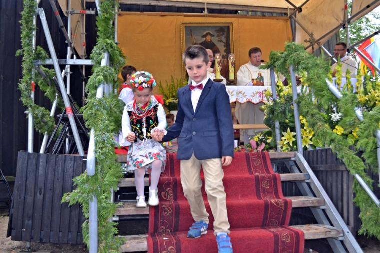 Czas wielkiego świętowania rozpoczął się procesją z Najświętszym Sakramentem i relikwiami Świętego Rocha z kościoła farnego do sanktuarium, zakończył jej powrotem. Zanim procesja z Najświętszym Sakramentem wyruszyła z sanktuarium do fary wyjątkowo gwarno zrobiło się wokół niego. W dniu uroczystości odpustowych przybyły wraz ze swoimi rodzicami do św. Rocha dzieci. Tu o godz. 18:00 ks. kan. Bogumił Kempa sprawował w ich intencji Mszę święta oraz skierował do wiernych rozważanie. Krótko po rozpoczęciu Eucharystii zaczął padać deszcz. Ksiądz Bogumił zaprosił dzieci, by zgromadziły się przy ołtarzu, bo zostało nad nim przygotowane zadaszenie. Na początku homilii kaznodzieja powiedział, że pierwszy raz głosi ją w takim towarzystwie. Wyraził radość z obecności tak wielu dzieci w sanktuarium u św. Rocha. Podkreślił, że dzieci przybyły tu po błogosławieństwo, które czyni człowieka szczęśliwym. Wyjaśniając istotę błogosławieństwa powiedział: „ Jeżeli błogosławię, to znaczy życzę komuś dobrze, życzę mu szczęścia. Przyszły tutaj te dzieci, aby mogły dostać Boże szczęście, dlatego tak ważna drodzy rodzice jest wasza obecność tutaj”. O tym jak ważne jest to, by rodzice błogosławili swoje dzieci mówił kaznodzieja w dalszej części rozważania. Zachęcał, by rodzice jak najczęściej błogosławili swoje dzieci. Dając świadectwo powiedział, że jego rodzice nadal błogosławią go, gdy wraca do domu, bądź z niego wyjeżdża. Stwierdził, że ważne jest to błogosławieństwo, bo uświadamia nam, że tylko Chrystus może dać nam prawdziwe szczęście. Nawiązując do postaci św. Rocha powiedział: „ Ten nasz wspaniały Patron, którego czcimy już od tylu dni jest tego dowodem. Ten człowiek doświadczył i cierpienia i złośliwości, doświadczył uwięzienia, doświadczył choroby. Doświadczył tego, że tak wielu ludzi się od niego odwróciło. A jednak jest błogosławiony, jest szczęśliwy”. W dalszej części rozważania ks. Bogumił zachęcał i prosił rodziców,aby uczestniczyli z dziećmi we Mszy św. i pokazywali im jak jest ona ważna. Podkreślił ponadto znaczenie przykładu rodziców i zachęcał, by klękali do modlitwy i uczyli jej swoje dzieci. Kończąc homilię kaznodzieja powiedział: „ Niech Boże błogosławieństwo z tego miejsca, z tego sanktuarium spływa na was, na wasze rodziny, na wszystkie dzieci, także na te nienarodzone, bo widzę że i takie też tu są. Niech Pan Bóg wam wszystkim błogosławi”. Została odmówiona specjalna modlitwa, a następnie kapłani udzielali dzieciom indywidualnego błogosławieństwa. Na pamiątkę spotkania u św. Rocha dzieci otrzymały obrazki. Były też i dla nich słodycze.