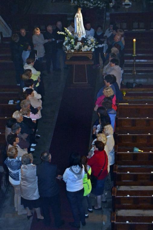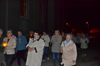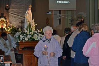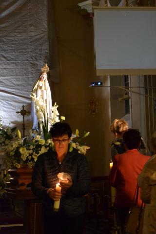 Kolejne postanowienia dotyczyły codziennej modlitwy do Ducha Świętego, a także obrania Maryi za Królową naszych serc. Podczas odmawiania piątej tajemnicy w świątyni zapłonęły lampiony przyniesione przez wiernych. Zostały one zapalone od świecy jubileuszowej stojącej przy figurze Fatimskiej Pani. Następnie odmówiliśmy modlitwę Anioła i ze śpiewem na ustach z zapalonymi lampionami wyruszyliśmy figurą Fatimskiej Pani z procesją wokoło kościoła. W tym czasie rozległ się dźwięk dzwonów, który przypomina nam o tym, by stanąć do Apelu Jasnogórskiego. Towarzyszy nam on od czasu nawiedzenia naszej parafii przez Czarną Madonnę w 2011 roku. Po powrocie do kościoła został odśpiewany Apel Jasnogórski . Maryjo: jesteśmy, pamiętamy, czuwamy- to wyznanie popłynęło ku niebu z naszego parafialnego wieczernika. Modlitwą w ten wieczór objęliśmy także zgromadzonych w polskiej Fatimie na zakopiańskich Krzeptówkach Kustoszy Sanktuariów i uczestników Międzynarodowego Kongresu Maryjno- Mariologicznego.