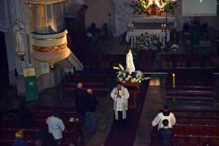 Tak jak co miesiąc, w okresie od maja do października, 13 września mikstaccy parafianie zgromadzili się o godz. 20:00 na nabożeństwie fatimskim. Mimo silnie wiejącego wiatru przyszli, by włączyć się w modlitewne wołania, ale także odpowiedzieć na prośbę skierowaną przed stu laty do trojga pastuszków, by odmawiali różaniec. Apel i prośba Maryi o modlitwę różańcową jest nadal aktualna. Jak zwykle na środku kościoła ustawiona została pięknie udekorowana figura Fatimskiej Pani. Wrześniowe nabożeństwo fatimskie poprowadził ks. kan. Krzysztof Ordziniak. Przed rozpoczęciem modlitwy różańcowej ks. kanonik podkreślił, że w życiu nieustannie o coś prosimy. Zwrócił uwagę zebranym w mikstackiej świątyni, że także przed stu laty ludzie prosili dzieci, by przedstawiły objawiającej się Matce Bożej prośby w różnych potrzebach. Ksiądz proboszcz przypomniał wiernym treść piątego objawienia fatimskiego, akcentując, że Maryja prosiła dzieci, by nadal codziennie odmawiały różaniec. Zaznaczył także, że we wrześniu 1917 roku Matka Boża zapowiedziała, iż w październiku uczyni cud. Kończąc wprowadzenie do modlitwy różańcowej ks. kanonik powiedział: „Trwajmy dziś na wspólnej modlitwie. Obecność Maryi doda nam sił w prośbach do Boga za siebie i bliźnich”. Następnie zachęcił, by każdy w cichości serca przedstawił Maryi intencje, z którymi przyszedł na nabożeństwo fatimskie.