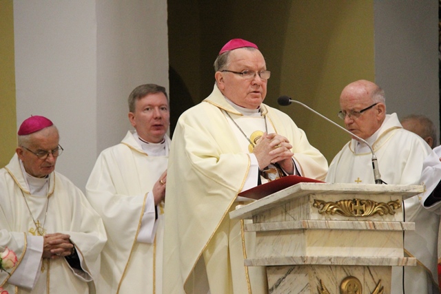 W imieniu duchowieństwa i całej wspólnoty parafialnej metropolitę wrocławskiego seniora abp Mariana Gołębiewskiego witał biskup kaliski Edward Janiak, który przypomniał dzieje budowy kościoła i powstania parafii pw. św. Antoniego Padewskiego w Ostrowie Wielkopolskim. Wspomniał proboszczów, którzy na przestrzeni 70 lat kierowali parafią. Wśród nich wymienił obecnego na uroczystości wieloletniego proboszcza ks. inf. Tadeusza Szmyta. – Ten kapłan przez 35 lat był proboszczem tej parafii, a więc połowa z tego jubileuszu to jego praca duszpasterska. Księże Infułacie cieszymy się, że jesteś żywym świadkiem tego kościoła. Ksiądz Infułat jest wielkim autorytetem w Ostrowie i od niego można uczyć się wielkiej solidności – mówił bp Janiak. Zachęcał wiernych do dziękczynnej modlitwy za wszystko, co wydarzyło się w tej parafii. – Niech św. Antoni, patron tej parafii, wstawia się za nami, abyśmy mogli następnemu pokoleniu przekazać nie tylko tę piękną świątynię, ale wiarę w święte tradycje, jakie pielęgnujemy – powiedział ordynariusz diecezji kaliskiej.