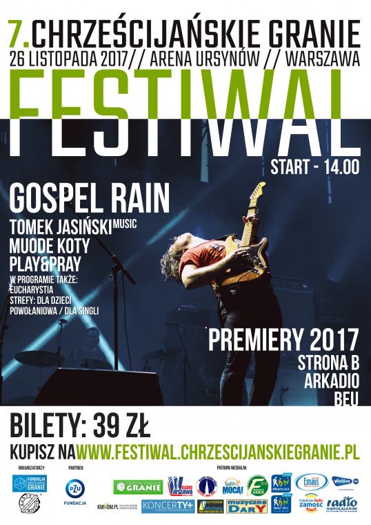 7. Festiwal Chrześcijańskie Granie odbędzie się 26 listopada 2017 na Arenie Ursynów w Warszawie. Zagrają na nim gwiazdy: Gospel Rain, Muode Koty, Play&Pray, Arkaadio, StronaB, Beu, Tomek Jasiński i inni.
