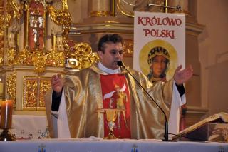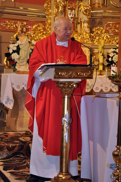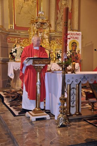 Słowa rozważania skierował do zebranych w mikstackiej farze ks. kan. Andrzej Grabański. Rozpoczynając zaznaczył, że chce się w nim odnieść do słów umieszczonych na sztandarach strażaków: „ Bogu na chwałę, ludziom na pożytek”. Podzielił homilię na dwie części. W pierwszej odnosząc się do hasła „Bogu na chwałę” nawiązał do słów św. Pawła i pytał, czy pomyśleliśmy o tym, że jesteśmy dziećmi Boga. Ks. kanonik zaakcentował, że jeżeli jesteśmy dziećmi Boga, to powinniśmy być przy Bogu, powinniśmy być podobni do Boga. Podkreślił, że jeżeli jesteśmy dziećmi Boga to powinniśmy z Nim przebywać, jemu służyć i być posłuszni. Jak zaakcentował ks. kan. Andrzej gdy będziemy wypełniali to czego Bóg od nas oczekuje będziemy żołnierzami Boga, będziemy wzorem. Kontynuując kaznodzieja przywołał słowa z Ewangelii „Nie bójcie się tych, którzy zabijają ciało, lecz duszy zabić nie mogą. Bójcie się raczej Tego, który duszę i ciało może zatracić w piekle” i zaznaczył, że zawarta jest w nich wskazanie jakie dobro mamy wybrać. Jako dzieci Boga mamy wybierać to co jest dobre w oczach Boga. W dalszej części homilii ks. kan. Andrzej rozważał słowa „ Ludziom na pożytek”. Podkreślił, że to Bóg wybrał strażaków do tej służby ludziom i usposobił ich do niej. Dalej pytał druhny i druhów, czy gdy biegną lub jadą samochodem na akcję, czy myślą o Panu Bogu. Kaznodzieja skierował do nich słowa podziękowania za ich nieustanną gotowość do tego, by służyć innym. Kontynuując refleksję ks. kan. Andrzej zastanawiał się nad przyszłością straży. Zwrócił uwagę na potrzebę otoczenia młodych, którzy wstępują w szeregi strażaków opieką. Podkreślił potrzebę dzielenia się z nimi swoim doświadczeniem. Życzył strażakom, by ich powołanie przekładało się na ich życie rodzinne, by nie musieli zbyt często wyjeżdżać do pożarów czy wypadków. Wiele słów podziękowań i uznania dla posługi strażaków zostało wypowiedzianych w tej homilii. Myślę, że do słów podziękowań dla druhów strażaków wypowiedzianych przez ks. kan. Andrzeja dołącza się cała społeczność Mikstatu i Komorowa.