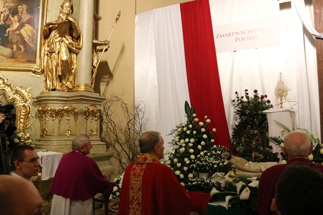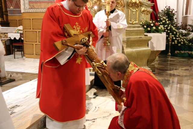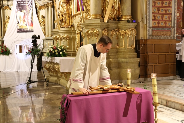 Po odśpiewaniu Męki Pańskiej i Modlitwie Powszechnej nastąpiło odsłonięcie krzyża i procesja z krzyżem wewnątrz świątyni. Wierni kilkakrotnie klękali i śpiewali ,,Święty Boże’’. Po komunii św., w asyście Straży Rzymskiej, przeniesiono Najświętszy Sakrament do grobu, gdzie trwa adoracja.