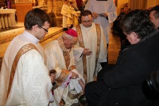 Podczas liturgii Wielkiego Czwartku bp Stanisław Napierała obmył nogi dwunastu mężczyznom – przedstawicielom parafian katedry św. Mikołaja w Kaliszu.