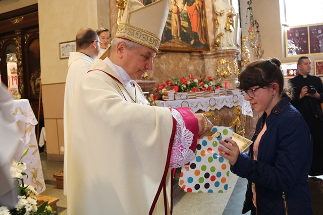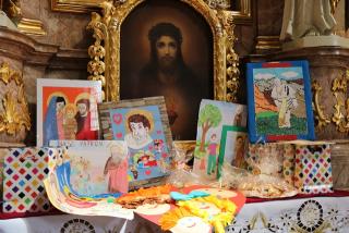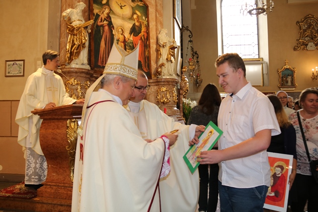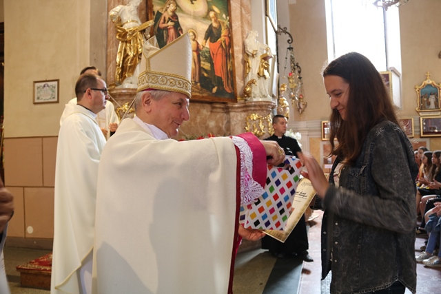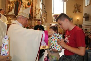 Biskup wręczył dyplomy i upominki laureatom konkursu plastycznego pt. „Św. Józef patron rodziny”. Uczniowie 9 szkół specjalnych z terenu diecezji kaliskiej wykonali obrazy przedstawiające św. Józefa.