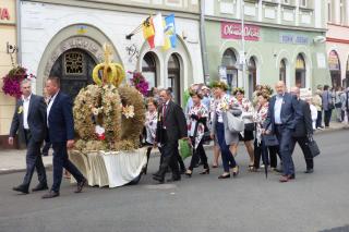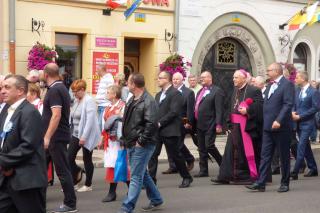 Na zakończenie wspólnej modlitwy pobłogosławił także przywiezione wieńce dożynkowe, w których, obok elementów religijnych, obecna była także tematyka narodowościowa.
