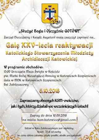 - uroczysta Gala, podsumowująca 25 lat istnienia KSM AK i Bal Jubileuszowy w Miejskim Domu Kultury „Szopienice-Giszowiec” (ul. Gen. J. Hallera 28, Katowice).