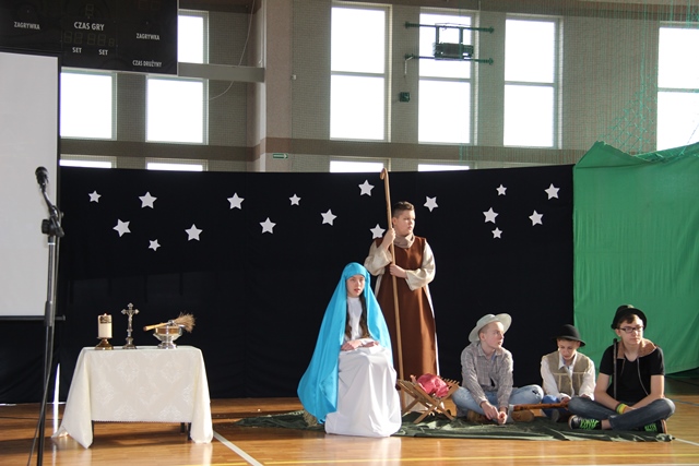 Uczniowie i goście wspólnie kolędowali. W przerwie między śpiewaniem kolęd kapłani, zastępca wójta i dyrektor szkoły złożyli uczniom życzenia z okazji zbliżających się ferii zimowych. Księża obdarowali dzieci i młodzież obrazkami.