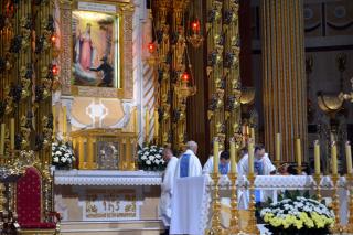 Jest już tradycją, w mikstackiej wspólnocie, że w okolicach  dnia,  w którym Kościół wspomina Najświętszą Maryję Pannę z Góry Karmel, popularnie nazywaną Matką Bożą Szkaplerzną pielgrzymujemy do Lichenia. W tym roku na pielgrzymi szlak wyruszyliśmy  17. lipca. Opiekunem duchowym  liczącej prawie czterdzieści osób grupy był ks. proboszcz Krzysztof Ordziniak. Czas podróży do Lichenia wypełniony był śpiewem Godzinek i modlitwą różańcową. Spotkanie  z licheńskim  sanktuarium rozpoczęliśmy od nawiedzenia kościoła pw. Matki Bożej Dziesięciu Cnót Ewangelicznych. Stanowi on część kompleksu klasztoru  Sióstr Anuncjatek. Tu ks. kan. Krzysztof przybliżył nam duchowość sióstr oraz zwrócił uwagę na ich wielobarwny strój.  Regułę życia stanowi 10 Cnót  Ewangelicznych Matki Bożej jako tej, która była: Najczystsza, Najroztropniejsza, Najpokorniejsza, Najwierniejsza, Najpobożniejsza, Najposłuszniejsza, Najuboższa, Najcierpliwsza, Najmiłosierniejsza, Najboleśniejsza. Kościół zachwyca prostym, pięknym, ale jednocześnie niezwykle wymownym wystrojem. Tabernakulum, krzyż, symbol Ducha Świętego i  wypisanych 10 Cnót Ewangelicznych wskazuje na to, co w życiu człowieka powinno być najważniejsze. Potem na chwilę zatrzymaliśmy  się w Kaplicy Sosny, miejscu gdzie Matka Boża objawiła się Mikołajowi Sikatce.  Jak co roku podczas nawiedzenia licheńskiego sanktuarium w lesie grąblińskim odprawiliśmy drogę krzyżową. Tym razem jednak inaczej niż zazwyczaj. Dlaczego? Zawsze czas pomiędzy poszczególnymi stacjami wypełnialiśmy śpiewem, modlitwą różańcową. Tym razem ks. kan. Krzysztof zaproponował byśmy przeszli ją w milczeniu. Był to niezwykły czas refleksji, zadumy, której sprzyjała deszczowa pogoda. Pomiędzy poszczególnymi stacjami krzyż przejmowali uczestnicy pielgrzymi. Odczytywane przez ks. proboszcza rozważania zatytułowane „Droga trudnych pytań” i panująca po nich cisza pozwalały wsłuchać się w głos mówiącego do nas Boga.  Pytania,  które wybrzmiały przy poszczególnych stacjach, były rzeczywiście trudne i uświadamiały nam nasze braki,  niedoskonałości w relacjach z bliźnimi, ale także skłaniały do refleksji nad przemijaniem. Pięknym duchowym przeżyciem była ta droga krzyżowa. O godzinie 10:00 uczestniczyliśmy w Bazylice Matki Bożej Bolesnej Królowej Polski  we Mszy Świętej. Wśród kapłanów ją sprawujących był ks. kan. Krzysztof Ordziniak, który modlił się we wszystkich naszych intencjach. Wiele ważnych słów skierował kaznodzieja do pielgrzymów. Nawiązując do słów Ewangelii  (Mt 11,20-24), zwrócił uwagę, że zapewne wiele osób dziwi się, jak ci, którzy słuchali słów Jezusa, widzieli cuda, które czynił mogło nie uwierzyć i nie nawrócić się. Zaakcentował jednak, że cuda dzieją się  i dziś i są zaproszeniem do  większej ufności. Celebrans podkreślił, że Eucharystia jest ucztą, na którą zostaliśmy zaproszeni przez Jezusa i Jego Matkę.  Kaznodzieja zwrócił uwagę, że nasza obecność jest wyrazem wiary w Boga żywego, a jednocześnie zaproszeniem do tego, by każdego dnia podejmować trud nawracania. W dalszej części homilii kapłan wskazał, że Maryja także została zaproszona do wiary żywej. Jak podkreślił, to dzięki wierze Maryi Jezus dokonał pierwszego cudu. Maryja będąc mistrzynią życia duchowego jest dla nas wzorem wiary ufnej i żywej. Kapłan przekonywał, że jest Ona tą,  która dostrzega ludzkie braki, zakłopotanie, potrzeby. W związku z tym zachęcał wiernych, by pozostawili u Jej stóp wszystkie bolączki i trudne sprawy. Apelował,  by przylgnąć do serca Matki, która pomoże przetrwać nam  trudne chwile. Kończąc homilię celebrans podkreślił potrzebę ciągłej modlitwy o łaskę żywej wiary. Po Mszy św. w bazylice można było wysłuchać koncertu organowego.Wielu udało się do kościoła św. Doroty, na Golgotę.  Przede wszystkim  był jednak czas na indywidualną modlitwę i refleksję. Wybierając się do tronu Matki Bożej Licheńskiej chcieliśmy jej przecież przedstawić prośby, podziękowania, podzielić się z Nią naszymi radościami i troskami. Po Mszy św. był właśnie ten  czas, czas na osobiste spotkanie z Matką i Jej Synem.