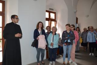 Z Lichenia udaliśmy się do Kazimierza Biskupiego. Tu nawiedziliśmy kościół pw. św. Marcina, który jest jednym z najstarszych  w Wielkopolsce. Najstarsza jego część datowana jest na 1020 rok. Jest to także sanktuarium  Pięciu Braci Męczenników. O ich życiu, męczeństwie, kulcie, historii opowiedział nam przewodnik. Sufit w kościele zdobią piękne polichromie. W zwieńczeniu ołtarza bocznego znajduje się obraz św. Rocha,  tak bliskiego naszej wspólnocie parafialnej. Z sanktuarium Pięciu Braci Męczenników przeszliśmy do zabytkowego klasztoru Misjonarzy Świętej Rodziny. Zapoznaliśmy się z jego historią. Kleryk będący  przewodnikiem opowiedział nam o miejscach posługiwania misjonarzy oraz o tym,  jak wygląda dzień w klasztorze. Zwiedziliśmy także salkę z pamiątkami  przywiezionymi z misji.