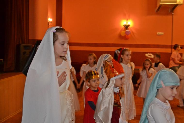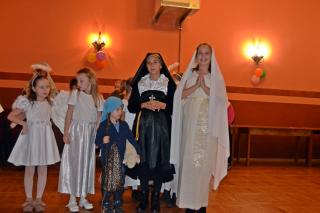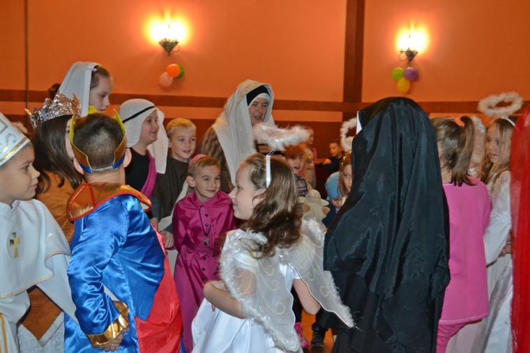 Tu  w MGOK- u odbył się mikstacki Bal Wszystkich Świętych. Tak jak na prawdziwym balu było zaproszenie do pierwszego tańca, który poprowadziła Maryja. Po pierwszym tańcu odbyła się prezentacja „ Świętych”  uczestniczących w balu. Najliczniejszą grupę stanowiły Anioły. Była na balu wspomniana już Maryja, były święte siostry zakonne, a wśród nich Apostołka Bożego Miłosierdzia Faustyna. Trzech chłopców przebrało się za św. Jana Pawła II. Na mikstackim Balu Wszystkich Świętych bawiły się m.in. św. Zofia, Jadwiga, Cecylia,  Marta, Matka Teresa z Kalkuty, ale także dzieci fatimskie.  Nie zabrakło Kacpra, Melchiora, Baltazara, św. Marka. Dobrze bawił się na balu pierwszy papież św. Piotr, który w dłoniach trzymał klucze. Był też założyciel Zgromadzenia Sióstr Franciszkanek Rodziny Maryi św. abp Zygmunt Szczęsny Feliński. Jego duchowe córki wcieliły się w postacie biblijne: Mojżesza i Nikodemy. Wszystkich Świętych uczestników mikstackiego trudno wymienić. Po prezentacji zabrzmiały ponownie dźwięki muzyki. Święci, to ludzi uśmiechnięci, więc kontynuowali radosną zabawę. Nie zabrakło konkursów i słodkości.