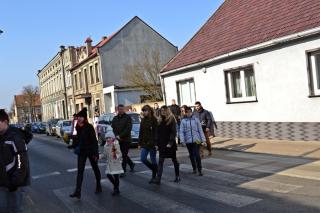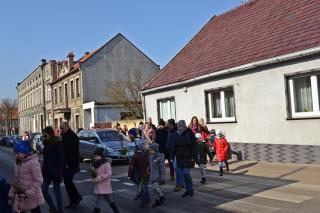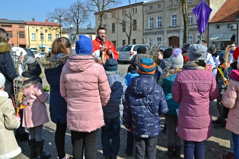 Młodsi zebrali się o godz. 10:50 przy figurze Serca Jezusowego na Rynku. Tu ks. wikariusz Krzysztof odczytał fragment Ewangelii opisujący wjazd Jezusa do Jerozolimy, następnie odmówił modlitwę i pobłogosławił przyniesione przez wiernych, głównie dzieci palmy. Po pobłogosławieniu palm zebrani na rynku udali się procesjonalnie do kościoła, gdzie ks. wikariusz Krzysztof Lipiński wraz z ks. kan. Grzegorzem Klapą sprawowali Eucharystię. W słowie skierowanym do zebranych w mikstackim wieczerniku ks. wikariusz podkreślił znaczenia dla wierzących nadchodzących dni Triduum Paschalnego. Zachęcał do uczestnictwa w nim zarówno dorosłych, jak i dzieci. W słowach skierowanych do rodziców zwrócił uwagę, że to na nich spoczywa obowiązek wyjaśnienia dzieciom znaczenia Triduum Paschalnego. Podkreślił, że najlepiej można to uczynić biorąc wspólnie w nim udział. Trudno jest wyjaśnić, opowiedzieć – jak powiedział jego istotę.