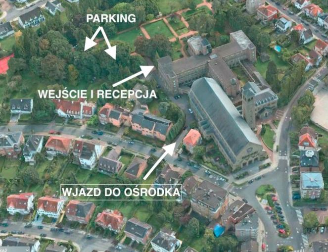 Wjazd i wejście do ośrodka znajduje się po lewej stronie kościoła jak również wjazd samochodów na parking. Wejście do budynku domu rekolekcyjnego i recepcji po schodach przy parkingu.