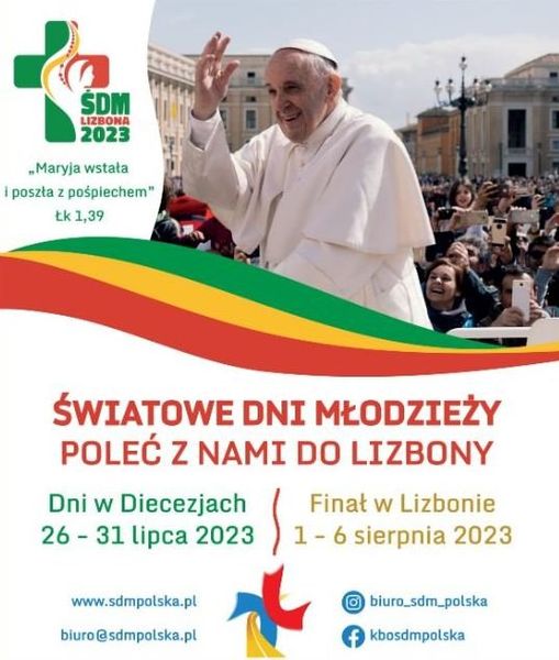 37. Światowe Dni Młodzieży odbędą się w dniach 1-6 sierpnia 2023 r. w Lizbonie pod hasłem: „Maryja wstała i poszła z pośpiechem” (Łk 1,39). Tradycyjnie, wydarzenie zostanie poprzedzone Dniami w Diecezjach, które zostaną zorganizowane w dniach 26-31 lipca. Grupa ponad 600 młodych ludzi mieszkających w kraju i poza jego granicami wyruszy wspólnie na Światowe Dni Młodzieży dzięki projektowi "Polonia i Polacy w drodze na ŚDM".
