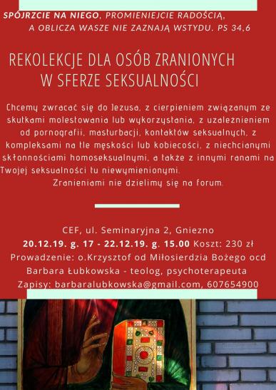 Karmelita o. Krzysztof Piskorz i terapeutka Barbara Łubkowska zapraszają do uczestnictwa w rekolekcjach osoby, które doświadczyły różnych zranień w dziedzinie seksualności.Najbliższe odbędą się w dniach 20-22 grudnia br. w Gnieźnie w Centrum Edukacyjno-Formacyjnym Archidiecezji Gnieźnieńskiej.