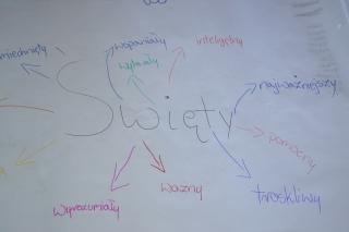 Po modlitwie ks. Krzysztof opowiedział młodym o   znaczeniu krzyża w życiu św. Rocha. Warto tu dodać, że urodził się on ze znamieniem krzyża na piersiach. Następnie dzieci obejrzały fragment programu „ Ziarno”  o św. Rochu. W znacznej części został on w 2014 roku zrealizowany w Mikstacie.  Następnie dzieci zostały podzielone na grupy i każda z nich tworzyła mapę pojęcia – święty, świętość. Potem przyszedł czas na prezentowanie wyników prac poszczególnych  grup. Może warto przytoczyć kilka określeń wymienianych przez dzieci – święty to pomocny, dobry, miłosierny, przebaczający, hojny, pobożny, mądry, śmiały, wytrwały,  troskliwy. Święty według dzieci to ktoś ważny, ale to także może być tato. Słowo święty dzieci skojarzyły także  z Kościołem, a ks. proboszcz podkreślił, że Kościół stanowimy my wszyscy. Poprzez chrzest zostaliśmy wezwani do świętości. Ponadto podczas pierwszego spotkania w Szkole Świętego Rocha A.D.  nie  mogło zabraknąć modlitwy nowennowej. Ksiądz kanonik wyjaśnił dzieciom, dlaczego właśnie dziś rozpoczęły się spotkania w Szkole Świętego Rocha, w które wpisana jest także nowenna. Poprzedziło ją wypisanie przez dzieci próśb i podziękowań, które chciałyby przedstawić Bogu przez wstawiennictwo św. Rocha. Po zakończonej modlitwie dzieci uczciły relikwie św. Rocha. Każde dziecko otrzymało bransoletkę z napisem WIARA SIŁĄ. Jest ona znakiem rozpoznawczym tych, którzy uczęszczają na spotkania.