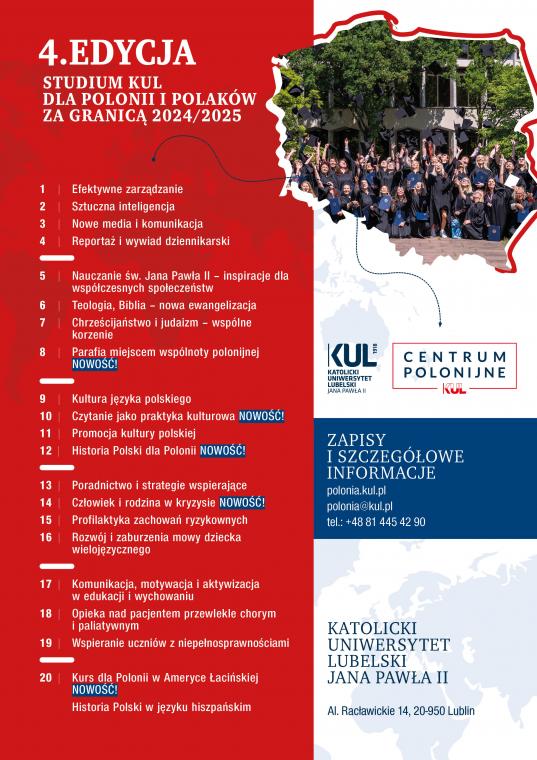 Trwa rekrutacja do IV edycji kursów Studium KUL dla Polonii i Polaków za granicą. Kursy trwają sześć miesięcy są prowadzone online na platformie MS Teams. W ramach kursów planowane są także zjazdy stacjonarne (z transmisją online) dla chętnych w wybranych krajach zamieszkania Słuchaczy. Od 2022 roku, w trzech edycjach Studium KUL, wzięło już udział ponad 2 tys. osób z ponad 30 krajów świata, m.in. z Wielkiej Brytanii, Francji, Niemiec, Belgii, USA i Kanady. Absolwenci otrzymują świadectwa ukończenia kursów w językach polskim i angielskim oraz certyfikaty udziału w Studium KUL w języku polskim i języku kraju zamieszkania. Wszystkie zajęcia w ramach Studium KUL dla Polonii i Polaków za granicą są bezpłatne