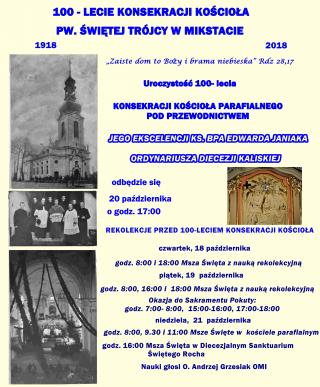 „ Zaiste dom to Boży i brama niebieska” Rdz 28,17 głosi napis nad wejściem do kościoła pw. Świętej Trójcy. Piękny jest ten Dom Boży mikstackiej wspólnoty parafialnej, która 20- go października będzie obchodziła 100- lecie jego konsekracji.