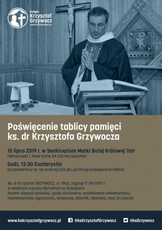 15 lipca 2019 r. w Sanktuarium Matki Bożej Królowej Tatr poświęcona zostanie tablica upamiętniająca ks. Krzysztofa Grzywocza.