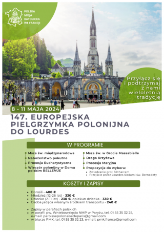 Już po raz 147. Polacy spotkają się w słynnym sanktuarium u stóp Pirenejów w ramach Europejskiej Pielgrzymki Polonijnej do Lourdes, która odbędzie się w dniach 8-11 maja br. Organizatorem wydarzenia jest Polska Misja Katolicka we Francji. Trwają zapisy. Serdecznie zapraszamy!