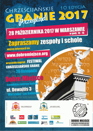 Przegląd Odbędzie się w Katolickim Centrum Kultury Dobre Miejsce przy ul. Dewajtis 3 w Warszawie 28.10.2017. Na przesłuchania konkursowe zapraszamy zespoły muzyczne i schole. Zapisy do 10.10.2017.