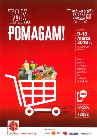 9 i 10 marca Caritas Polska we współpracy z Caritas diecezjalnymi zorganizuje w supermarketach, sieciach handlowych i sklepach osiedlowych w całej Polsce 14. edycję zbiórki żywności pod hasłem „TAK, Pomagam!”.