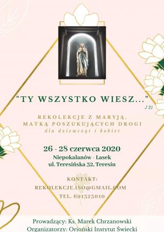 “Ty wszystko wiesz” – to rekolekcje dla kobiet z cyklu “Maryja – Matką poszukujących drogi”. Odbędą się od 26 do 28 czerwca w Niepokalanowie.