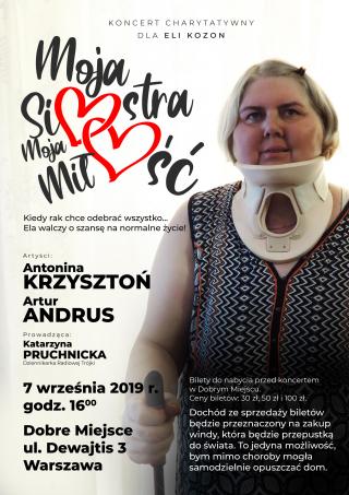 Dobre Miejsce - Katolickie Centrum Kultury serdecznie zaprasza na koncert charytatywny pt. "MOJA SIOSTRA MOJA MIŁOŚĆ''. Dochód z koncertu będzie przeznaczony na zakup windy, która będzie przepustką do świata dla walczącej z rakiem ELI KOZON.