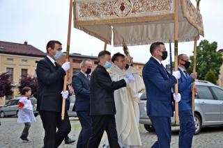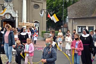 Po Mszy Świętej udaliśmy się w procesji  z Najświętszym Sakramentem na Rynek.  Nie mogło zabraknąć sztandarów, feretronów, dzieci niosących poduszki z symbolami eucharystycznymi i oczywiście dziewczynek sypiących kwiatki przed  niesionym przez kapłana w monstrancji Jezusem ukrytym pod postacią Chleba.