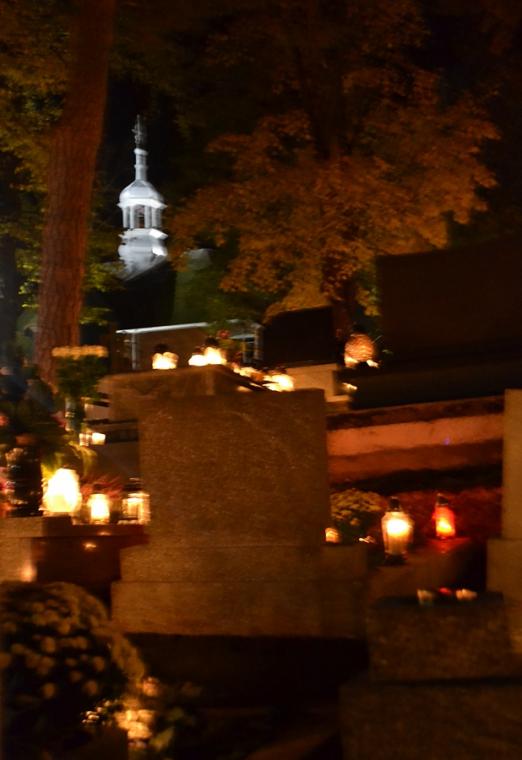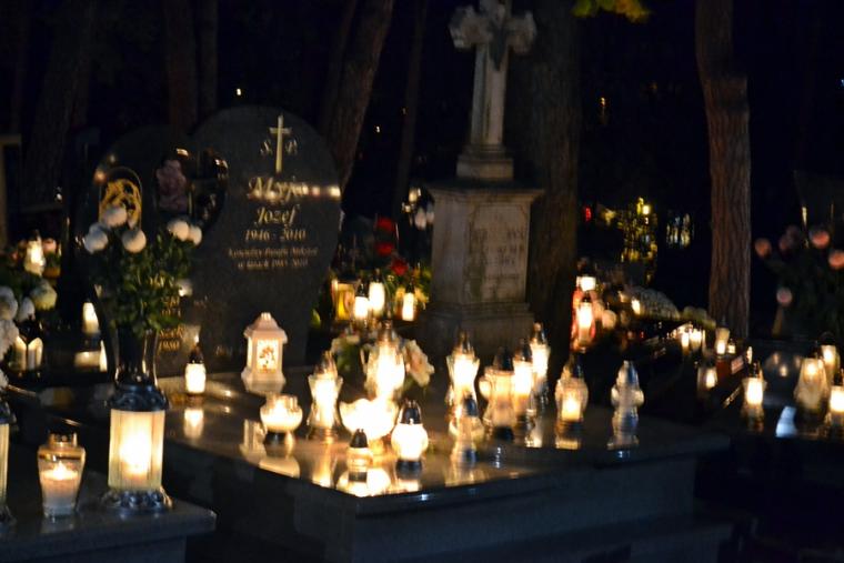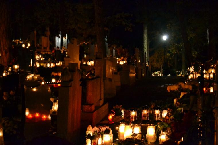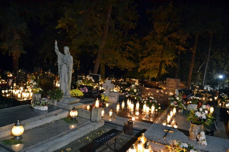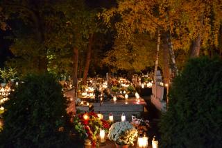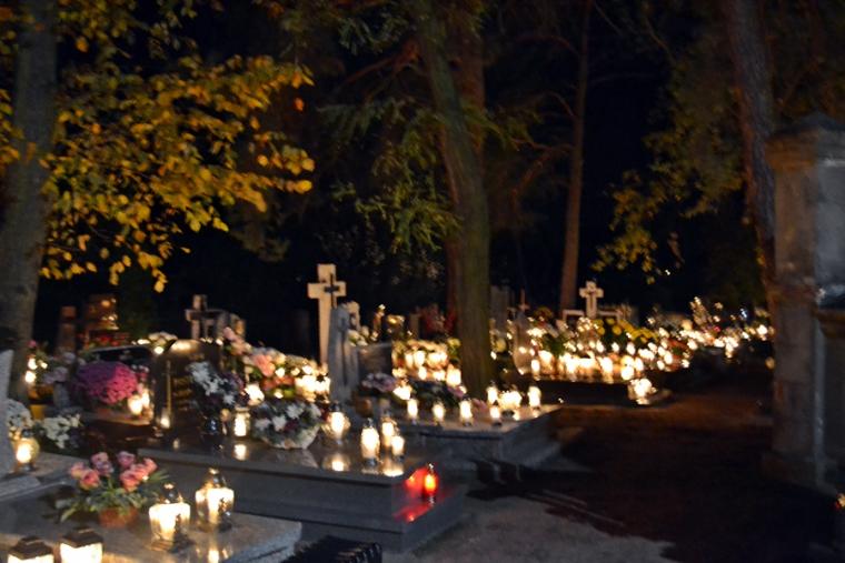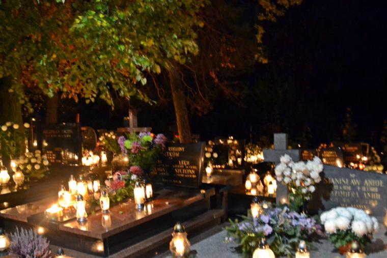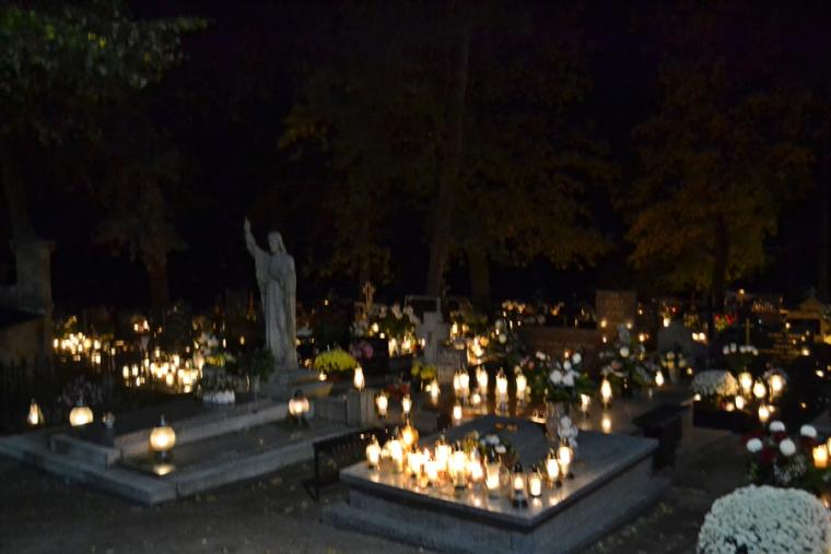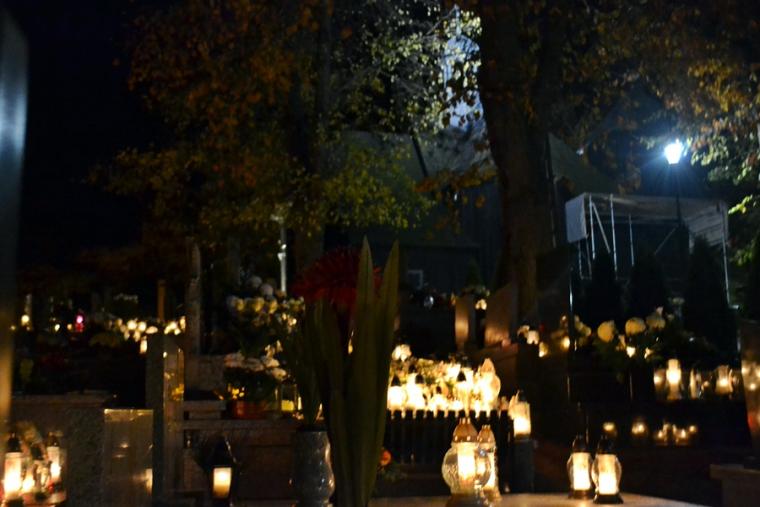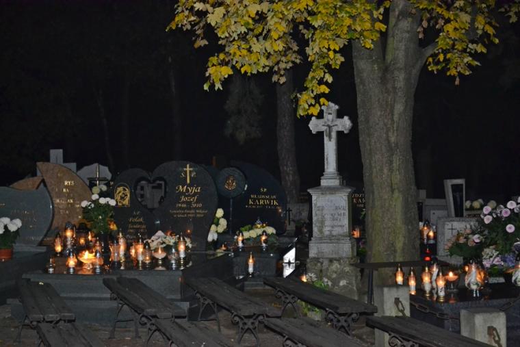 Mikstacki cmentarz wieczorem w uroczystość Wszystkich Świętych