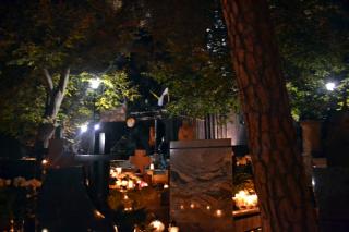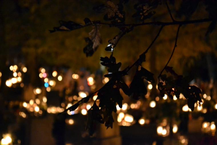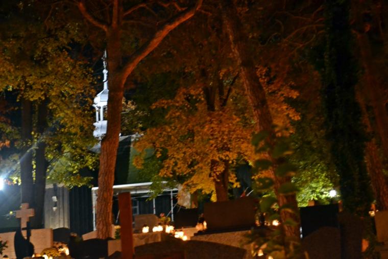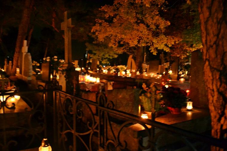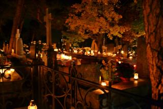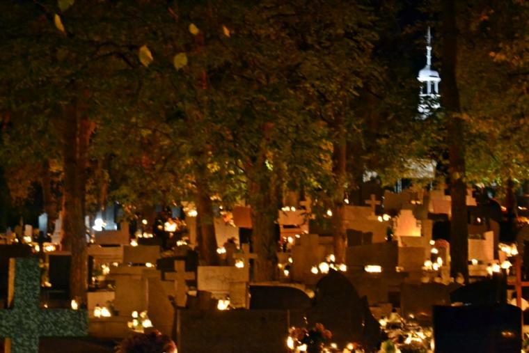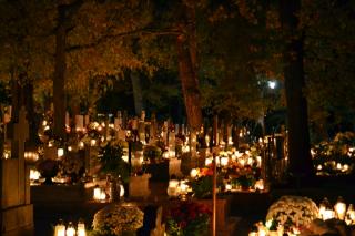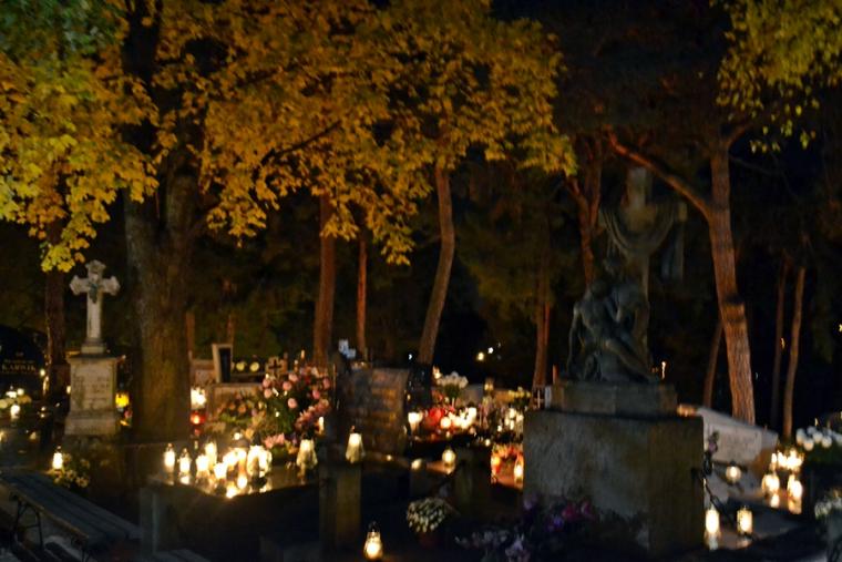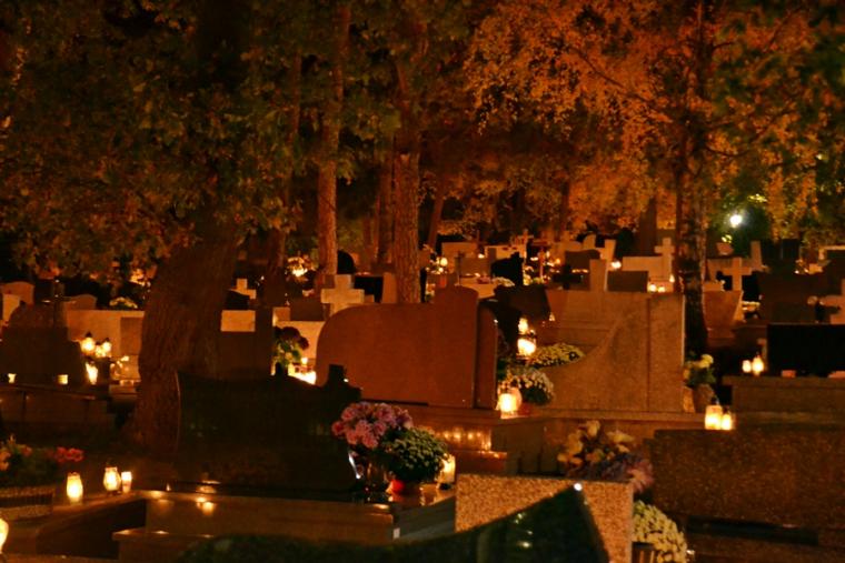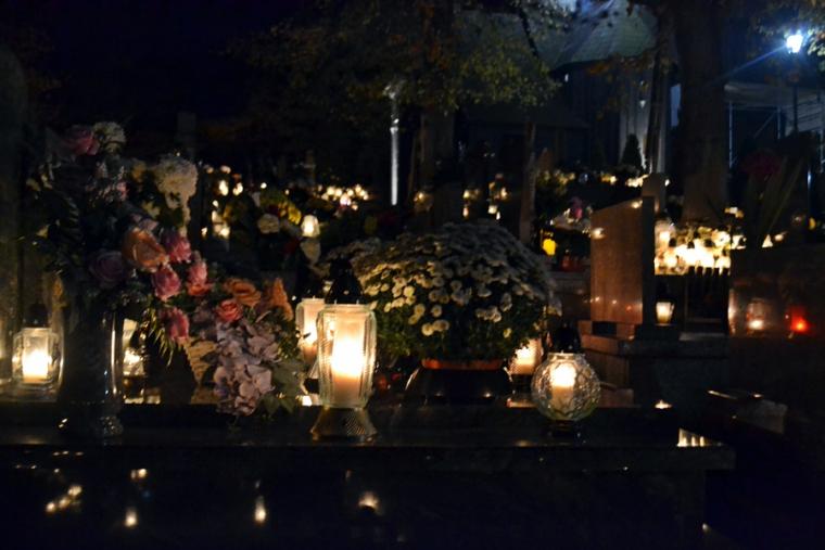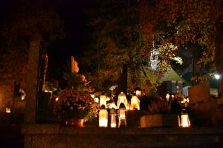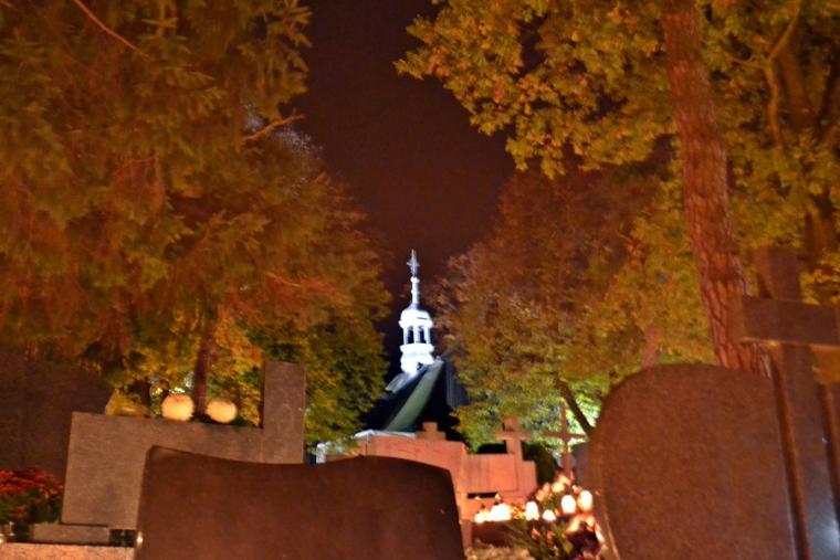 Mikstacki cmentarz wieczorem w uroczystość Wszystkich Świętych