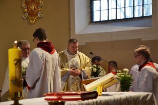 Wielki Czwartek, dzień ustanowienia Sakramentu Eucharystii i Kapłaństwa, przepełniony był dziękczynieniem. W tym dniu o godz. 18:30 zebraliśmy się w parafialnym wieczerniku, by dziękować za ustanowienie Eucharystii i Sakramentu Kapłaństwa, za szafarzy sakramentów, za tych, których Pan powołał i posłał, by prowadzili nas do Boga. Kapłani sprawujący posługę w mikstackiej parafii dziękowali za łaskę powołania oraz prosili o nowe, święte powołania do służby Bogu i ludziom. Mszy Wieczerzy Pańskiej przewodniczył ks. Marcin Walczak. Wraz z nim przy ołtarzu stanęli ks. kan. Krzysztof Ordziniak, ks. kan. Grzegorz Klapa i ks. kan. Zbigniew Mielcarek.