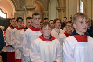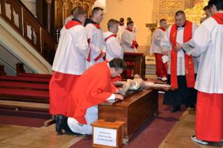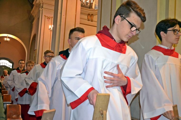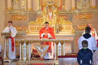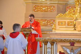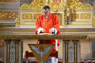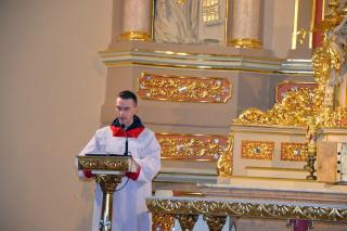 Liturgii Wielkopiątkowej przewodniczył ks. kan. Krzysztof Ordziniak. Niezwykła cisza i modlitewna zaduma zapanowała w kościele, gdy kapłan w tzw. geście właściwym Wielkiego Piątku leżał krzyżem przed ołtarzem. Podczas liturgii wielkopiątkowej odczytany został opis Męki i Śmierci Pana Jezusa. Podczas liturgii wielkopiątkowej kilka słów refleksji na temat krzyża w życiu człowieka skierował do licznie zebranych w świątyni wiernych ks. kan. Krzysztof. Kapłan zaakcentował, że Wielki Piątek jest dniem krzyża. Wskazał, że Kościół zatrzymuje się, aby ukazać ludziom cenę, za jaka Chrystus nas zbawił. Dodał jednak, że milczenie Wielkiego Piątku nie jest milczeniem rozpaczy, ale zadumy i refleksji nad miłością, która jest zdolna do największej ofiary. Kaznodzieja zachęcał zebranych do modlitwy i postawienia sobie pytania, czy potrafimy przyjąć krzyż. Krzyż, jak podkreślał, stoi w centrum Liturgii. Zwrócił uwagę na obnażony ołtarz, na którym brakuje obrusów, świeczników, kwiatów. Był natomiast pewien bardzo ważny gest. Powiedział: „celebrans(…) padł na twarz. To przejmujący znak modlitwy księdza leżącego na posadzce kościoła- jak podczas święceń kapłańskich. Trochę tak, jakby liturgia chciała nam przypomnieć, że bycie księdzem, bycie chrześcijaninem, jest powiązane z wejściem w tajemnicę Krzyża”. W dalszej części rozważania kapłan przywołał obraz znajdujący się w starym klasztorze. Przedstawia on Jezusa niosącego wielki krzyż, a wokół Niego wielu ludzi z małymi krzyżykami w ręku. Kapłan wskazał, że każdy człowiek ma swój krzyż. Podkreślił, że autor tego obrazu chciał ludziom przypomnieć słowa Chrystusa: „ Jeśli kto chce pójść za Mną, niech się zaprze samego siebie, niech weźmie krzyż swój i niech Mnie naśladuje”. Kontynuując, ks. proboszcz Krzysztof podkreślał potrzebę podjęcia swego krzyża i podążania z nim za Chrystusem. Wskazał na wielorakość i różnorodność krzyży, które trzeba przyjąć w swoim życie. Jest ich tak wiele, jak wielu jest ludzi. Zwrócił uwagę na krzyż samotności, zdrady, odrzucenia, choroby, nieszczęśliwych wypadków, śmierci bliskich. Kontynuując powiedział: „Krzyż ma wiele imion. Jedno jest pewne: trzeba podjąć swój krzyż, aby upodobnić się do Chrystusa. Kto nie bierze swego krzyża, nie jest Mnie godzien - mówi Jezus”. Kapłan zwrócił uwagę wiernych, że aby zrozumieć i podjąć swój krzyż, trzeba zrozumieć krzyż Chrystusa. To z niego mamy czerpać siłę i moc. W końcowej części rozważania kapłan przywołał postać Karola Antoniewicza, autora pieśni: „ W krzyżu cierpienie, w krzyżu zbawienie…”. Wskazał trudne koleje jego życia: śmierć dzieci, żony. Jego żona w czasie choroby mówiła do niego: „Karolu, trzeba głośno dziękować, a cicho cierpieć”. Po jej śmierci wstępuje do jezuitów. Ma dar przemawiania do cierpiących. W czasie epidemii z wielkim oddanie posługuje chorym. Sam się zaraża i tuż przed śmiercią pisze pieśń „ W krzyżu cierpienie, w krzyżu zbawienie, w krzyżu miłości nauka…”