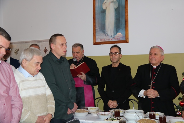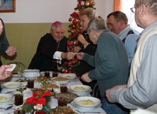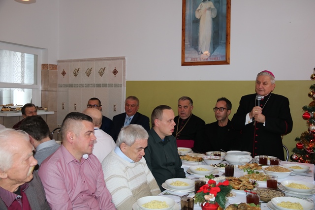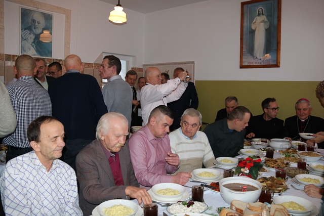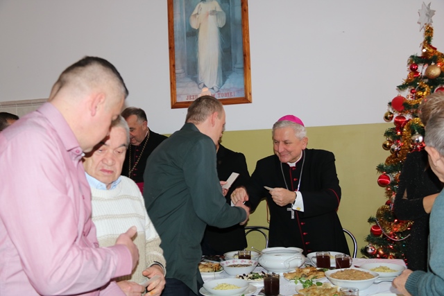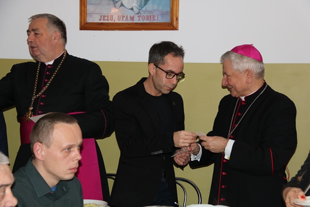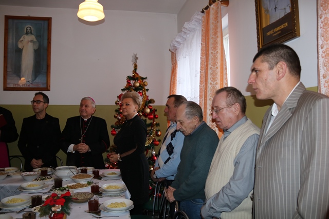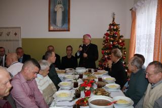 41 mężczyzn zasiadło dzisiaj przy wigilijnym stole w Schronisku św. Brata Alberta w Kaliszu. Z mieszkańcami opłatkiem przełamał się biskup kaliski Edward Janiak.