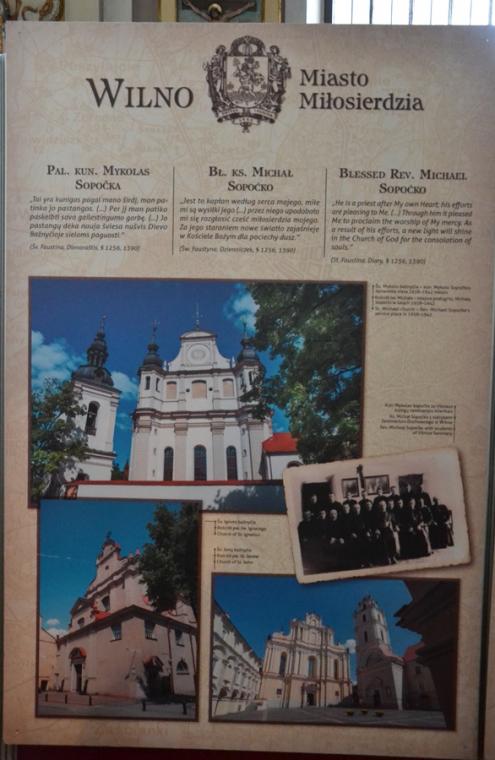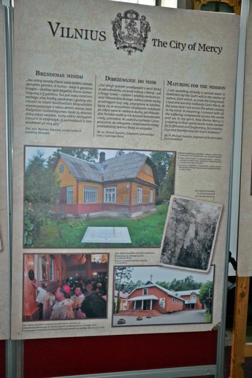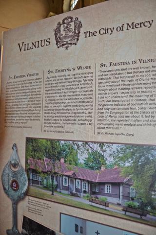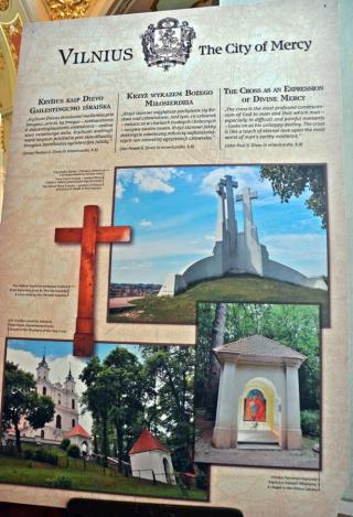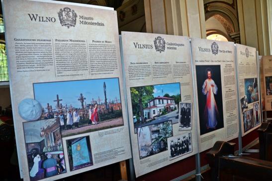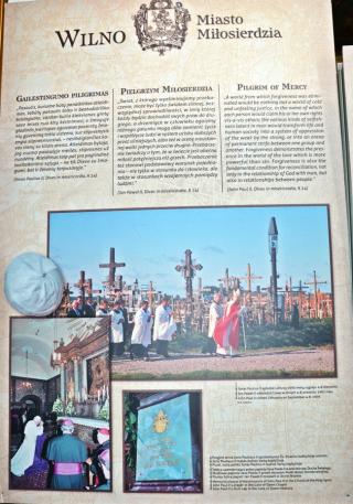 Ponadto w lipcu organizowana jest z parafii pielgrzymka do Wilna. Wystawa ma więc zachęcić do wyruszenia na pielgrzymi szlak, a tym którym nie będzie to dane przybliżyć miejsca związane z kultem Bożego miłosierdzia. Jest ich jak możemy się przekonać oglądając wystawę bardzo wiele. Pomysłodawcą wystawy jest ks. Mariusz Marszałek, były sekretarz ks. Abp Wilna Gintarasa Grusasa. Po raz pierwszy została zaprezentowana w Senacie w 2016 roku. Autorem zdjęć jest artysta i fotograf Marian Dzwinel. Wystawa składa się z 16 plansz, na których umieszczone są zdjęcia i teksty w trzech językach polskim, litewskim, i angielskim. Oto niektóre tytuły prezentowanych na wystawie plansz: Apostołka Bożego Miłosierdzia, Święta Faustyna w Wilnie, Matka Miłosierdzia, Nadzieja, Dzieła Miłosierdzia, Na drogach Bożej Opatrzności, Obraz Jezusa Miłosiernego, Nowe zgromadzenia, Krzyż wyrazem Bożego miłosierdzia i kilka innych. Na jeszcze jedną chcemy zwrócić uwagę – Nowa iskra, a na niej Sanktuarium Miłosierdzia Bożego i tekst Aktu zawierzenia losu świata Miłosierdziu Bożemu przez św. Jana Pawła II. Dodajmy, że każda plansza zawiera opis miejsca, bądź fragment z Dzienniczka św. S. Faustyny, czy pamiętnika, listów bł. Michała Sopoćko.