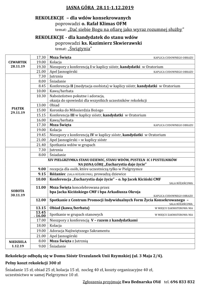 Pielgrzymka połączona jest z rekolekcjami stanowymi, które odbędą się w terminie od 28 listopada do 1 grudnia 2019 r.