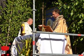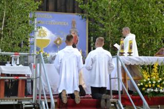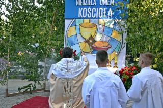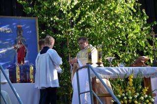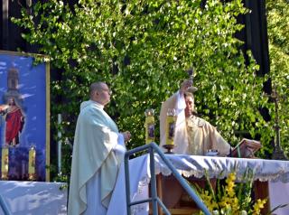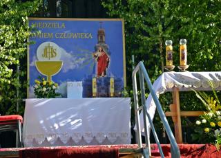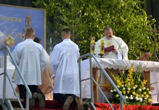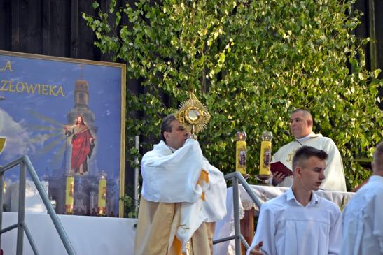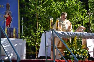 Homilię w czasie tej Eucharystii sprawowanej m.in. w intencji wszystkich obsługujących procesje i przygotowujących ołtarze wygłosił ks. kan. Krzysztof Ordziniak. Na początku kaznodzieja zauważył, że bardzo licznie zgromadzili się w tym dniu wierni w sanktuarium i wokół niego. Zaznaczył, że Chrystus, który jest bogaty w miłosierdzie pochyla się nad każdym człowiekiem, nad każdą ludzką nędzą ukazując mu swe serce pełne miłości. Ksiądz kan. Krzysztof podkreślił, że Bóg nieustannie zaprasza nas byśmy korzystali z Jego miłosierdzia, wskazując, że jest ono jedynym ratunkiem dla człowieka i świata. Zaznaczył, że współczesny człowiek bardzo potrzebuje Bożego przebaczenia, Bożej miłości i obecności. Doświadczenie Bożego miłosierdzia powinno mobilizować nas do miłości do Boga i bliźnich. Celebrans zwrócił uwagę, że Chrystus nieustannie mnoży dla nas swój Chleb. Gdy przyjmujemy Go w Komunii Świętej obdarza nas potrzebnymi siłami, doświadczamy Jego obecności, która jest źródłem otuchy, siły, odwagi.