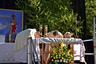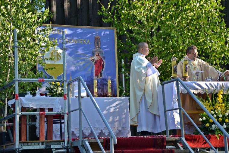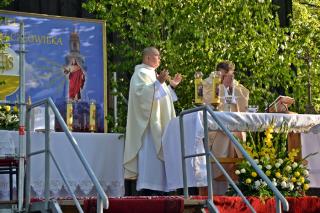 Zaakcentował, że zgromadził nas Boży Stół, na którym Jezusa jako Chleb kładzie nam samego siebie. Celebrans zwrócił uwagę, że powinniśmy Mu za to dziękować, wielbić Go, ale przede wszystkim ufać jego dobroci. Zaznaczył jednak, że nasza wdzięczność jest niepełna jeśli nie potrafimy na Boże miłosierdzie odpowiedzieć miłosierdziem wobec bliźnich. Kończą kaznodzieja powiedział: „Boże miłosierdzie to wielka „ słabość” Boga do człowieka, ale dzięki tej „słabości” istniejemy. Ona nam mówi, że Bóg nie zmęczył się człowiekiem, dzięki niej doświadczamy Jego dobroci, przebaczenia. To właśnie dzięki tej „słabości” Bóg wciąż na nowo lituje się nad człowiekiem, troszczy się, okazuje miłosierdzie i prosi zacznij od nowa”.